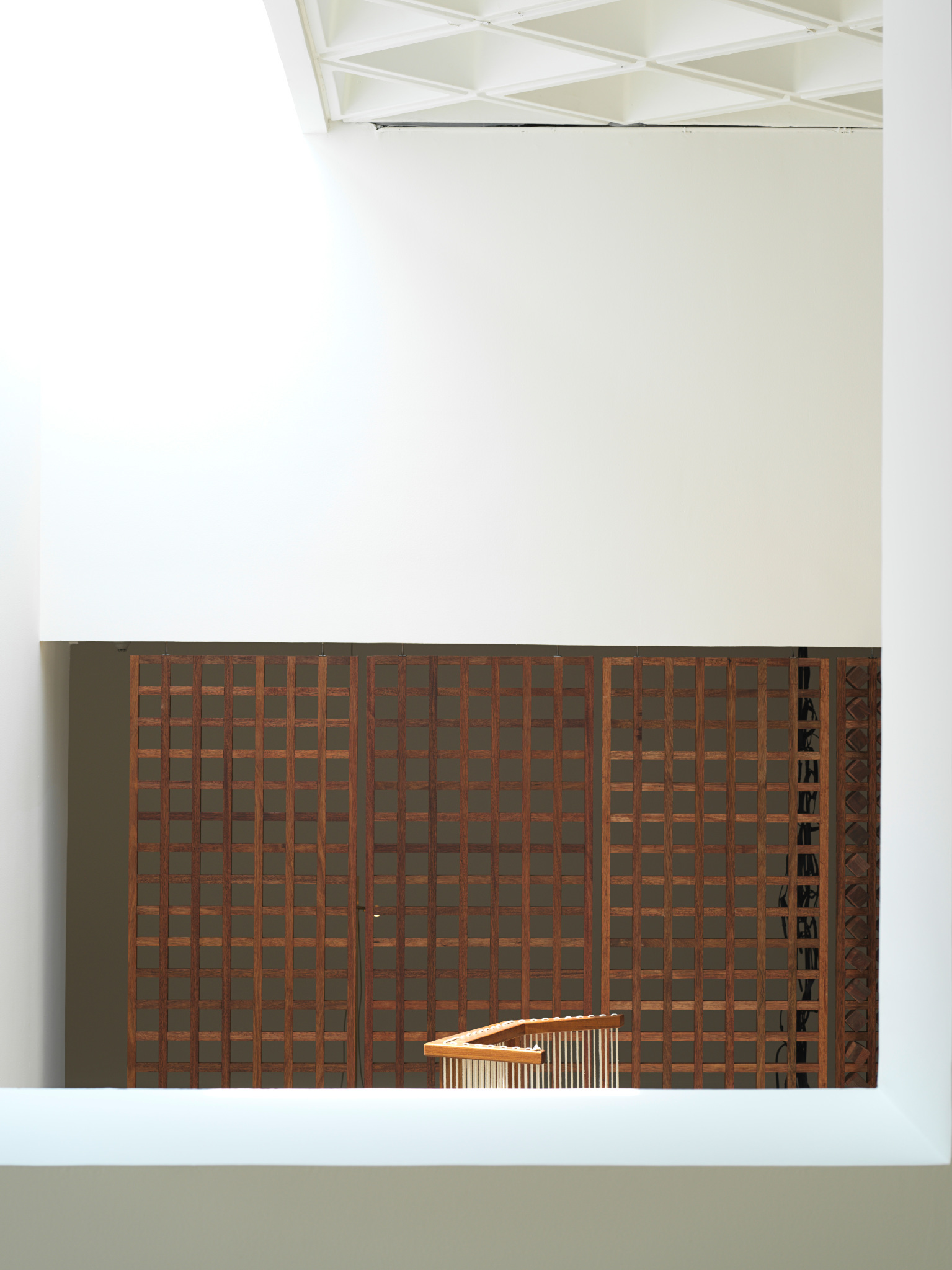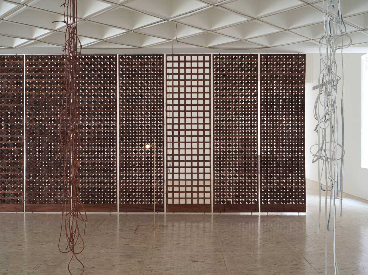 Para su exposición en el Museo Tamayo, la artista presenta una serie de obras que dialoga específicamente con la arquitectura del edificio. Las instalaciones atraviesan los interiores del edificio generando ambientes traslúcidos que a su vez crean capas y superposiciones visuales a lo largo de las salas, de modo que las obras terminan por formar un solo cuerpo escultórico en el espacio. Por su parte, el uso de cuerdas modela el espacio entre el piso y el techo, conectando así los puntos vacíos que se generan entre una escultura y otra.