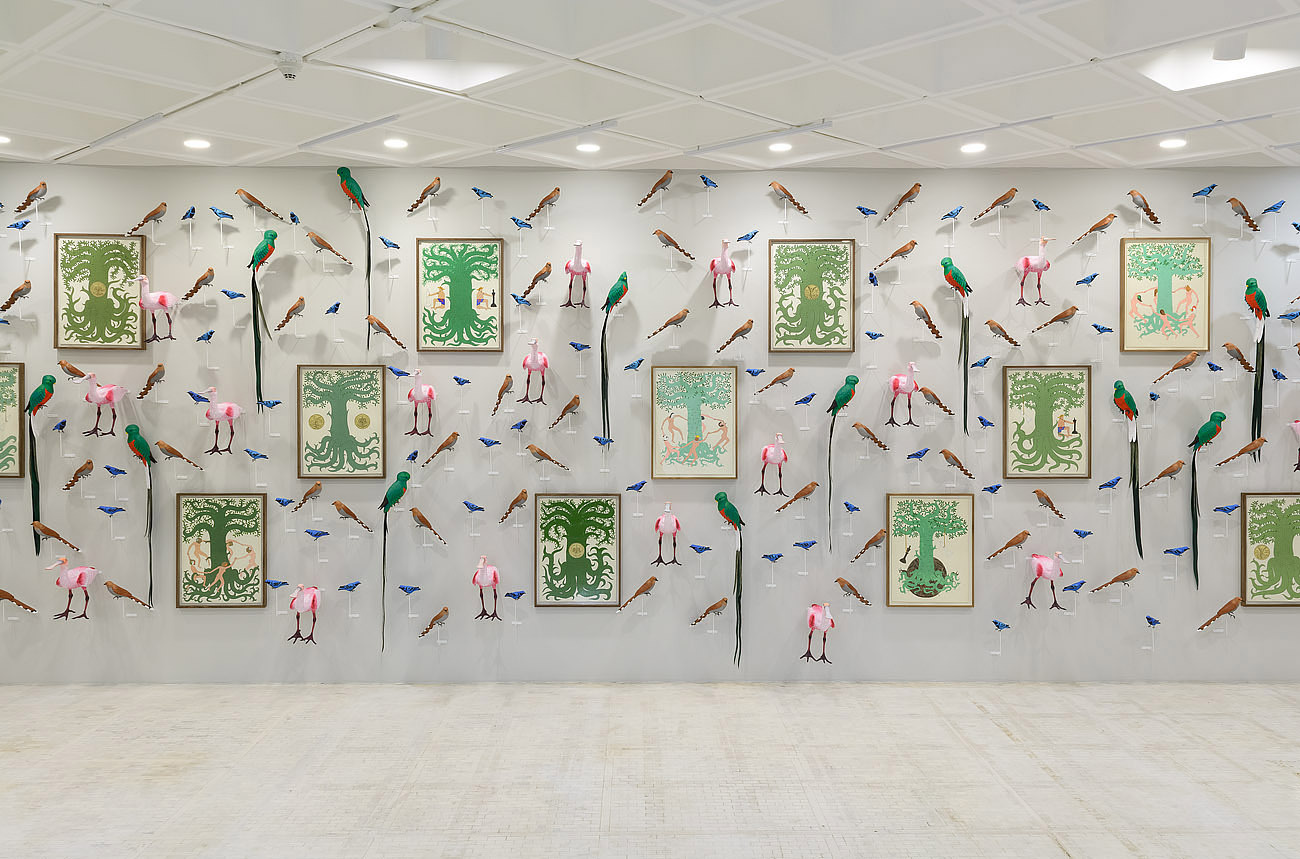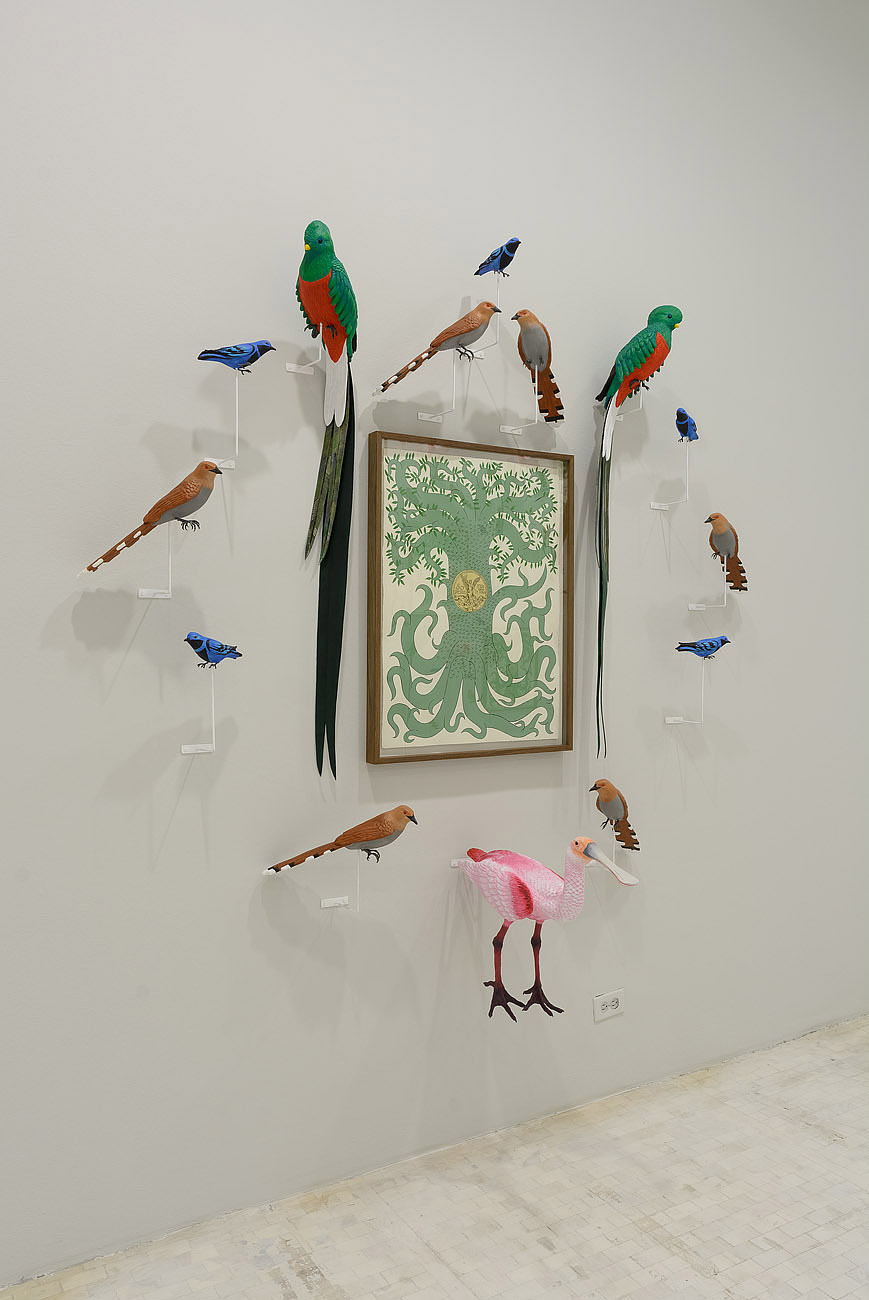 Serpiente emplumada y otros festejos es la instalación más reciente concebida por el artista a partir de una fascinación personal por el quetzal –sus mitos y su realidad actual. En ella se extiende un montaje de esculturas y dibujos que sugieren posibles caminos hacia terrenos fronterizos. Serpiente emplumada y otros festejos es una acumulación alegórica de relatos ancestrales, referentes del contexto político, nuevas mitologías y una colección de taxidermia que reúne cerca de 300 aves, entre las que se encuentran el quetzal, la cotinga azul, el cuco ardilla y la espátula rosada.