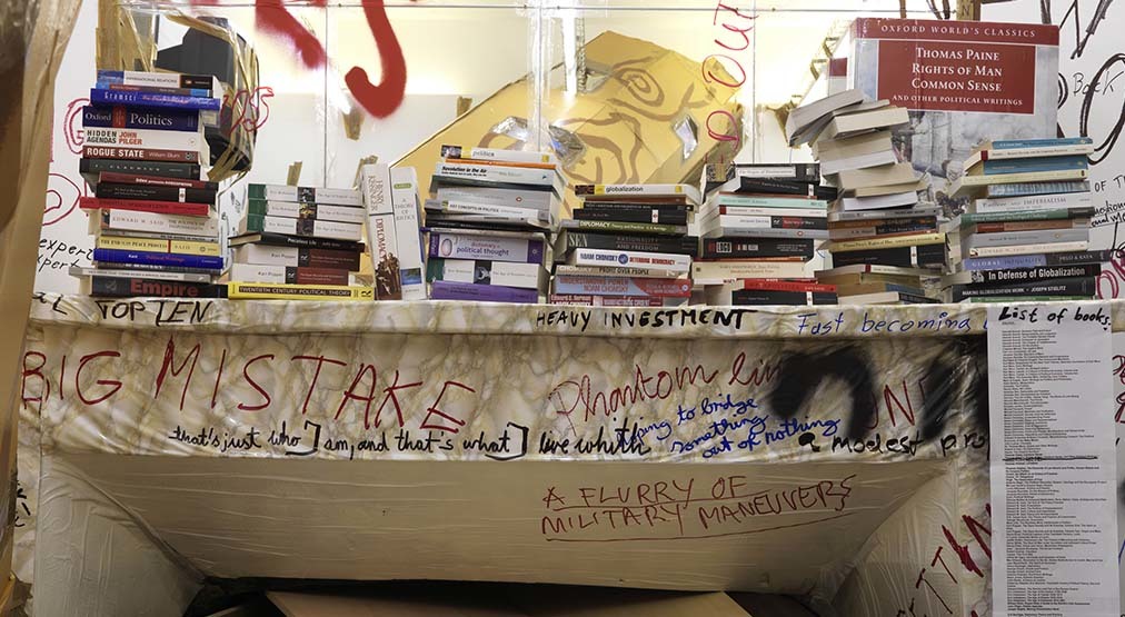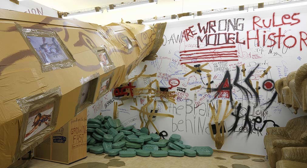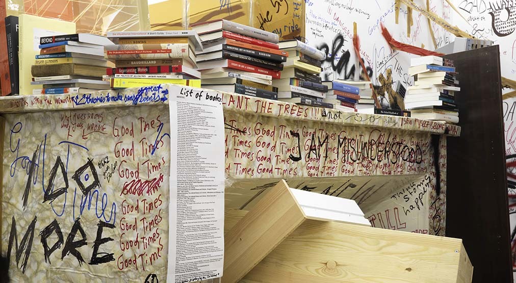 El artista suizo Thomas Hirschhorn (Berna, 1957) presenta Stand-alone, un gran collage extendido en el espacio en el cual ha materializado dos preguntas ¿Dónde estoy parado? y ¿Qué es lo que quiero?. En esta pieza se relacionan, a modo de rizomas, diversas cuestiones −filosóficas, estéticas y políticas− con alusiones al mundo de la moda, el diseño, la literatura y la historia del arte.